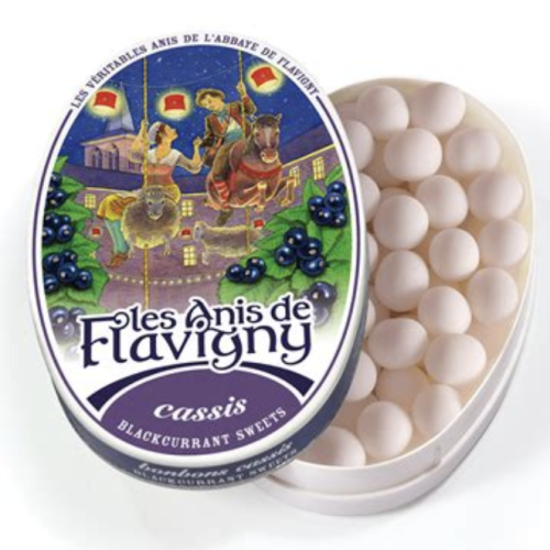 Anis de Flavigny Black Currant Cassis candies in oval tin. The French mint. Flavigny is a town in Bourgogne (Burgundy), 1.7oz , made in France
